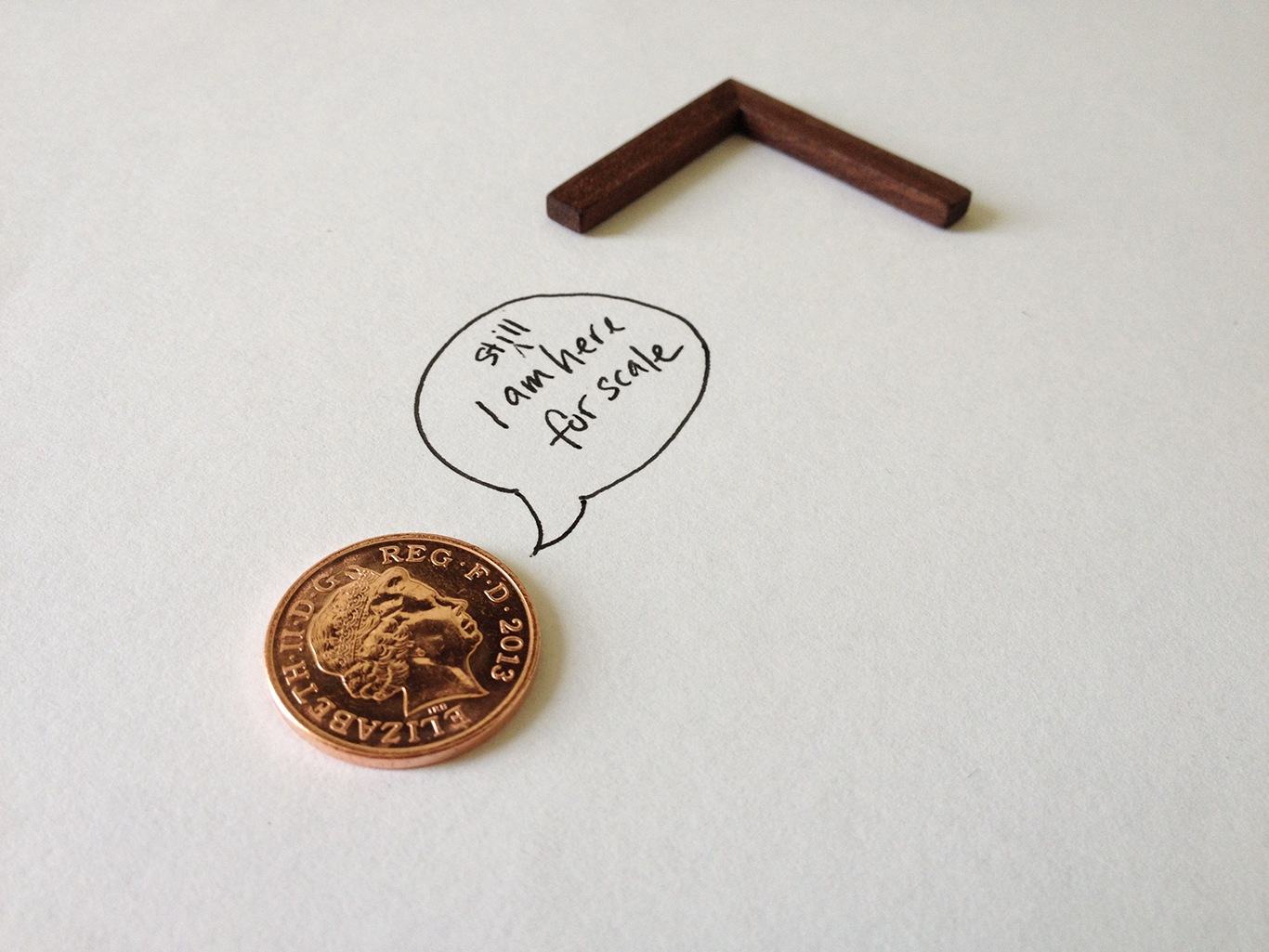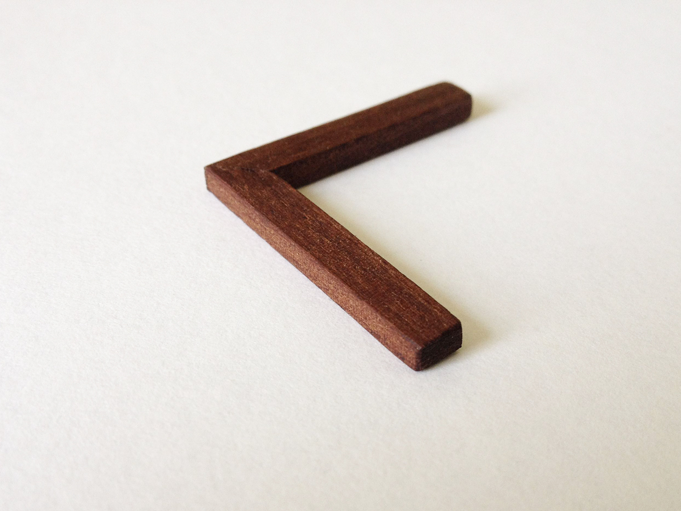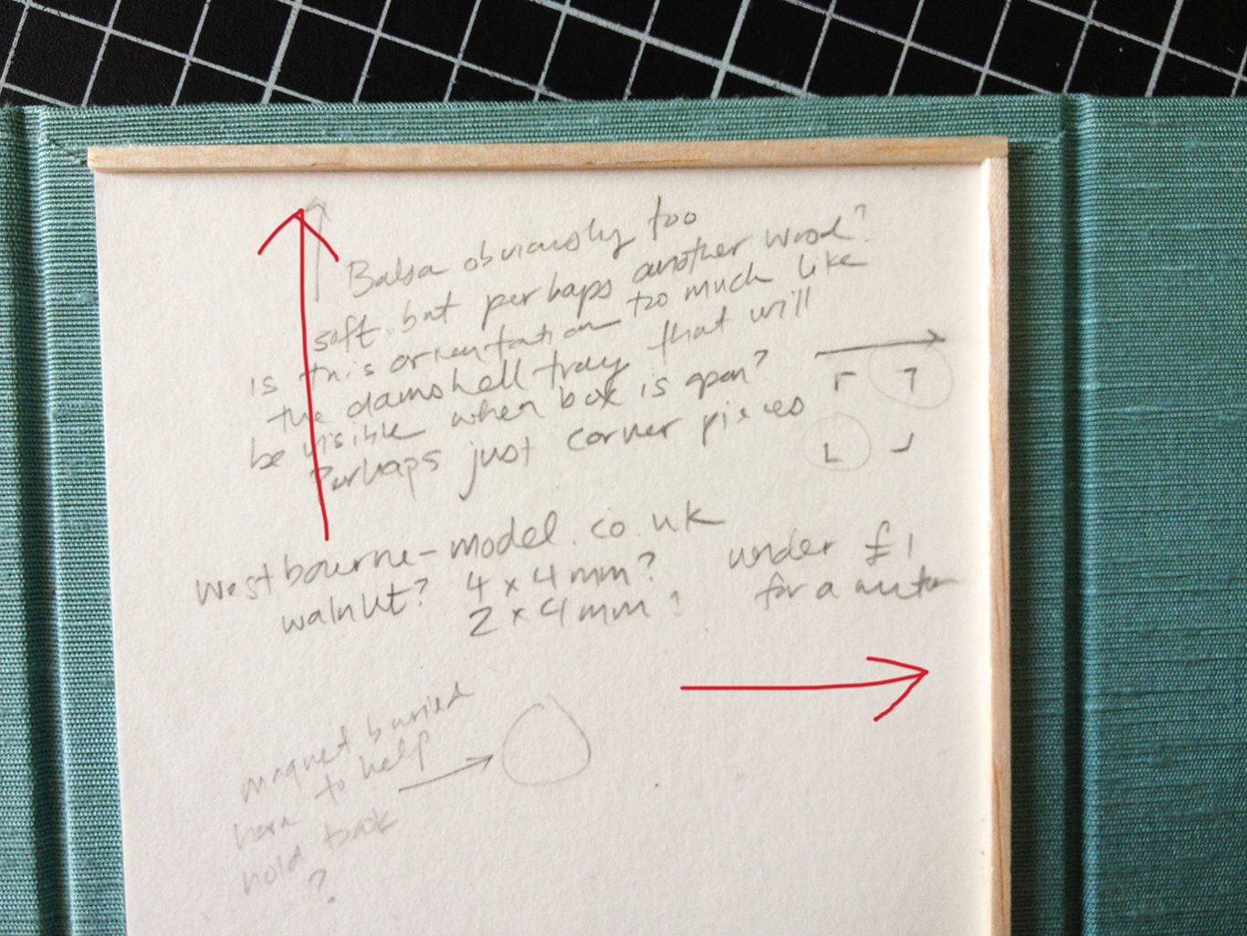 A little corner made of binder’s board covered in paper. Lumpy? yes. A perfect right angle? No. But perhaps the right direction to go. More recently, I’ve been thinking about wood. A quick test in balsa on this small mockup got me thinking that the best solution might just be a set of two wooden corners arranged diagonally from one another.