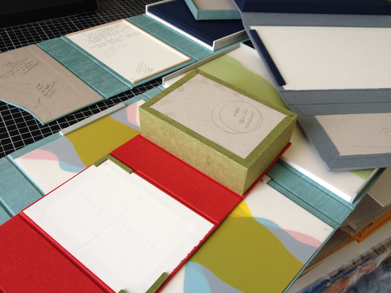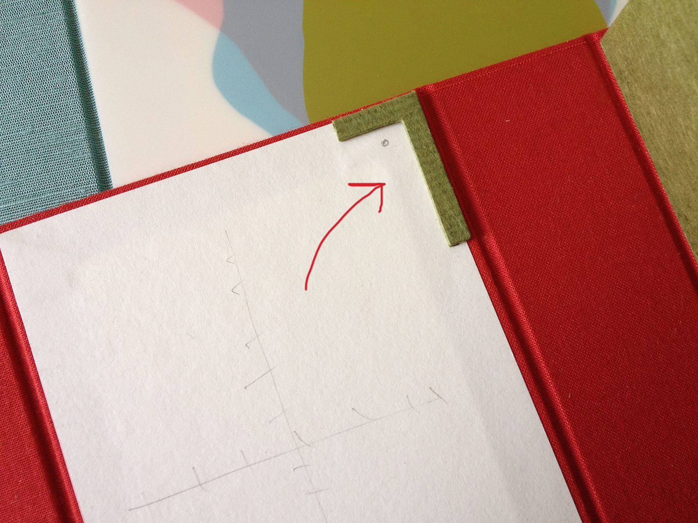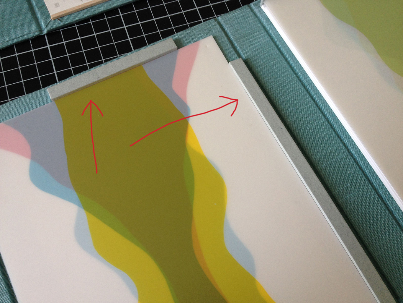 But how to make this an intuitive and functional area? In my early mockups I’ve tried a few solutions to this problem. In the mockup above, I am using two pieces of double thickness binder’s board covered in paper to catch and trap the sheets in the same position relative to one another.