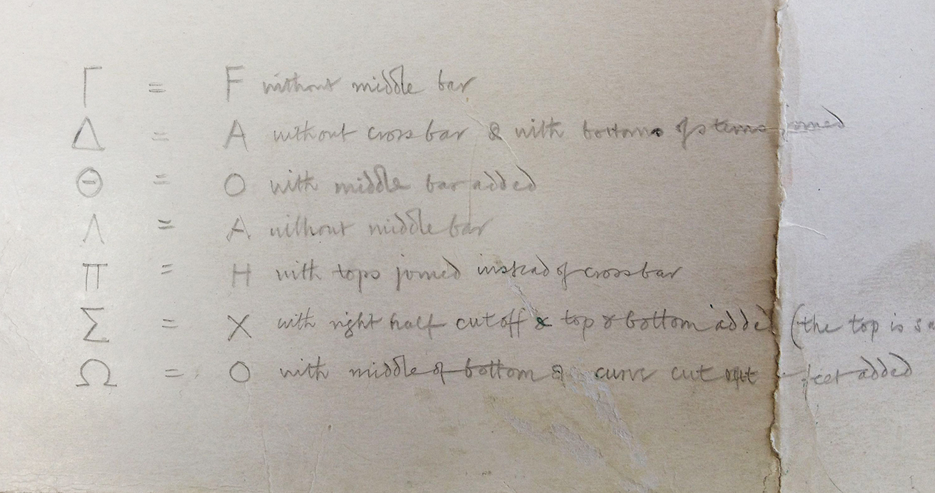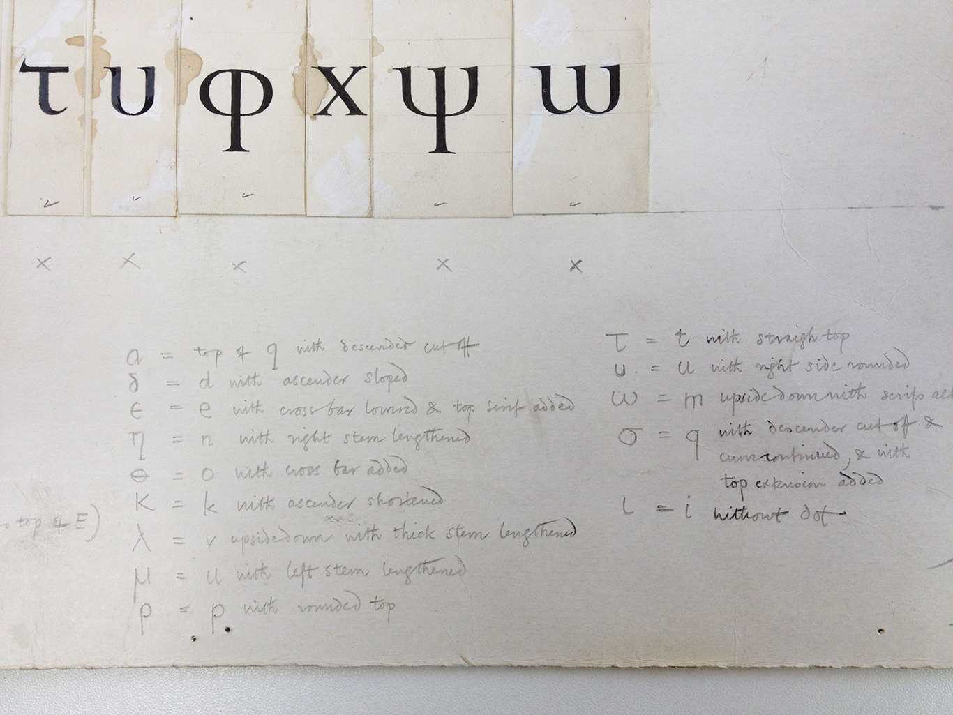 Perhaps what is most interesting about these drawings are Gill’s detailed instructions on how to build a Greek alphabet simply by adapting or converting Latin letterforms.   δ (delta) is simply a “d with ascender sloped.”  ε (epsilon) is an “e with cross bar lowered & top serif added.” ι (iota) is “i without dot.” And so on. Gill’s simple equations are examples of Latinisation, a touchy issue among type designers.