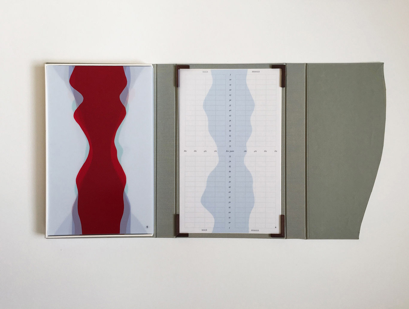 A lidded box on the left contains 114 sheets of drafting film printed with figures representing population data for every region on earth. A booklet placed in the center panel contains an index to help interpret the data and a short essay by David Allen about our process and sources.
