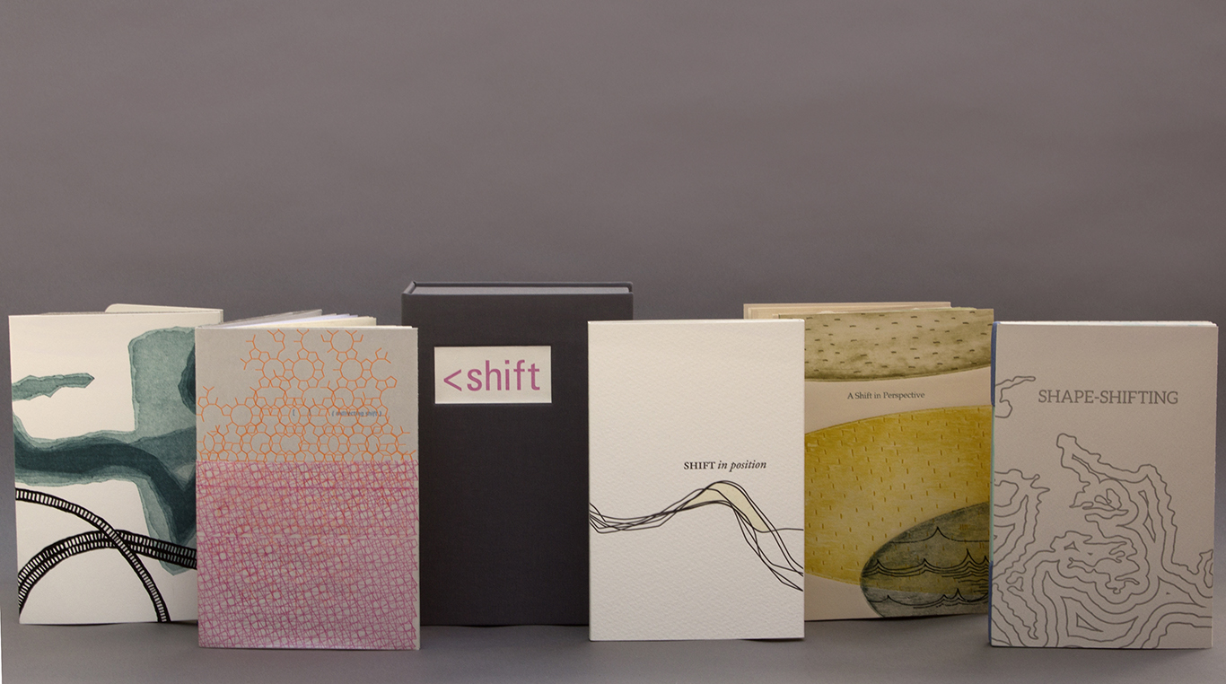 Each of the five of us created a book of identical dimensions with the theme of shift, a word that plays a fundamental part of our practice as artists and printmakers. Content ranges from an investigation of the diggings of the Erie canal, images of a shifting body during sleep, the translation of glyphs and grid systems, two perspectives in a conversation, and the physical shift in a page. Of this edition of 20, only six copies are currently available for $1200.