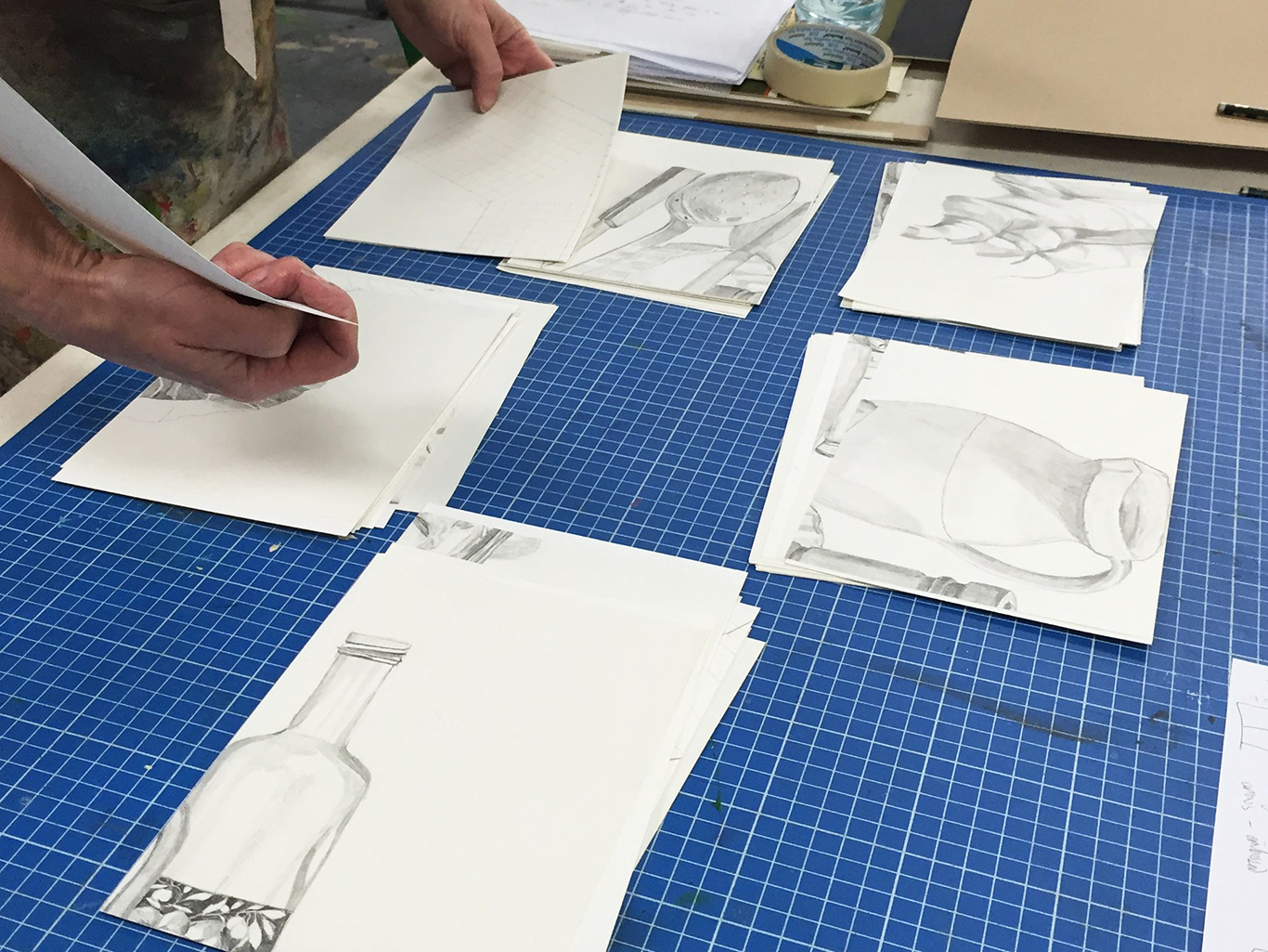 Often teaching gives me an opportunity to see some new and inspiring things. I spent last week with Su Bonfanti, helping her execute her plan for a book project. Su came prepared for our week, bringing a series of drawings that she and her sister had made years ago, a polymer plate she had ordered, and some text she wanted to work with. She started by cutting down the drawings and sorting the sheets.