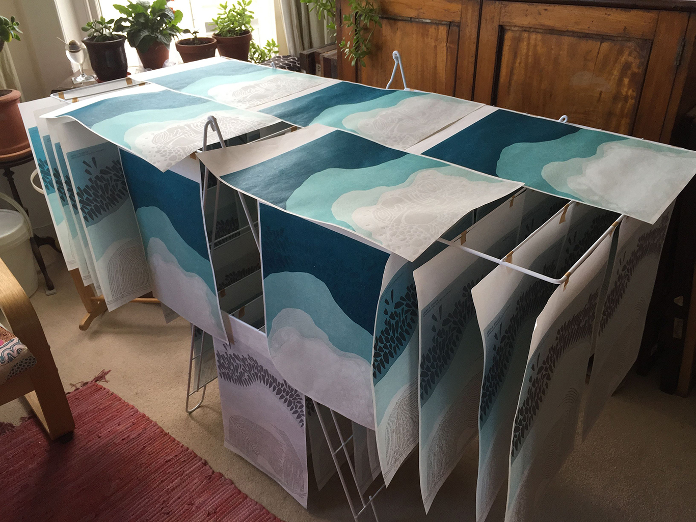 I’ve finally cleared the last of the Marina prints off of the drying rack. We haven’t been able to do any laundry for the last two weeks while we’ve been waiting for five heavy layers of ink to dry. Here is the final version, front and back: