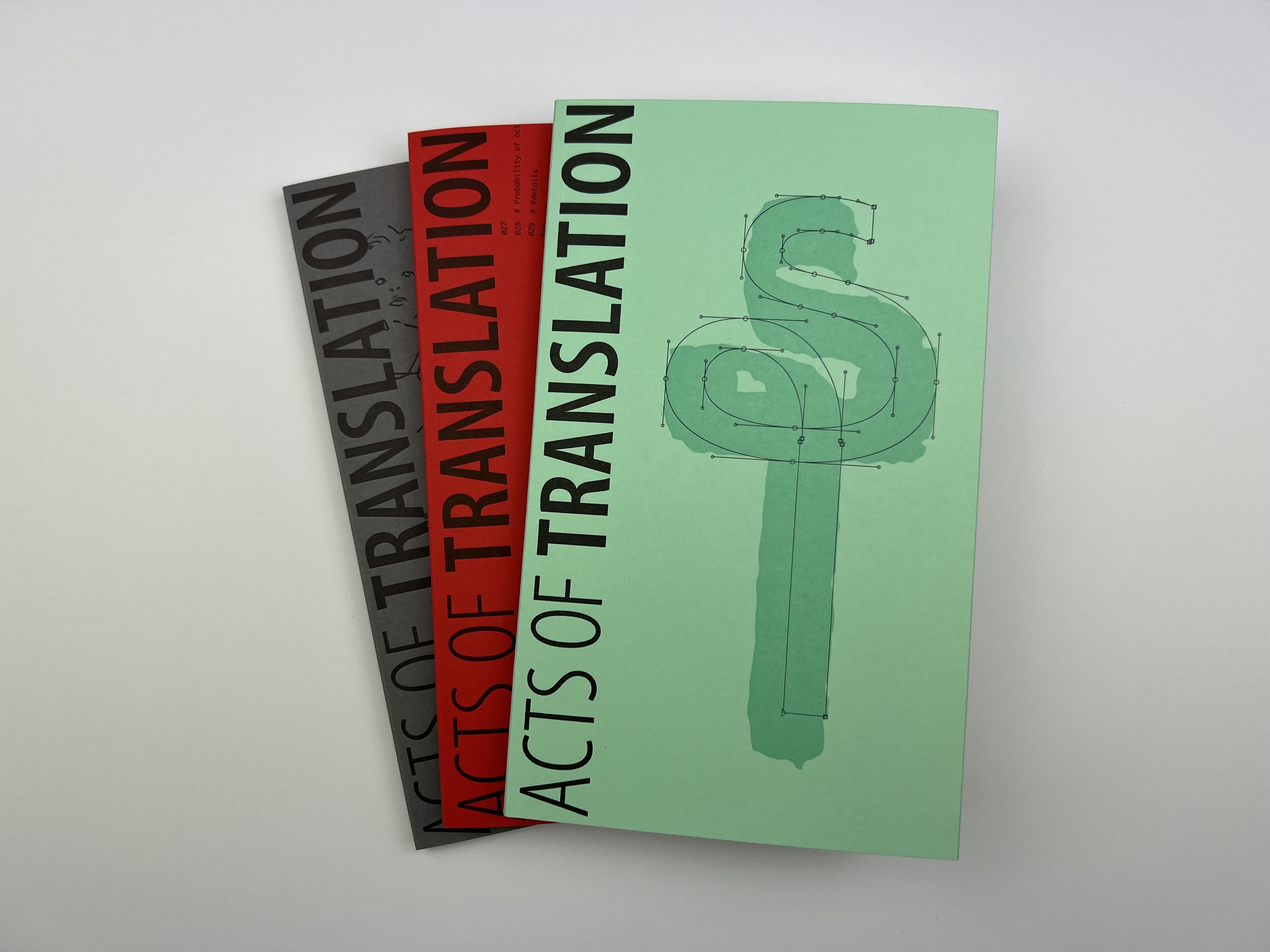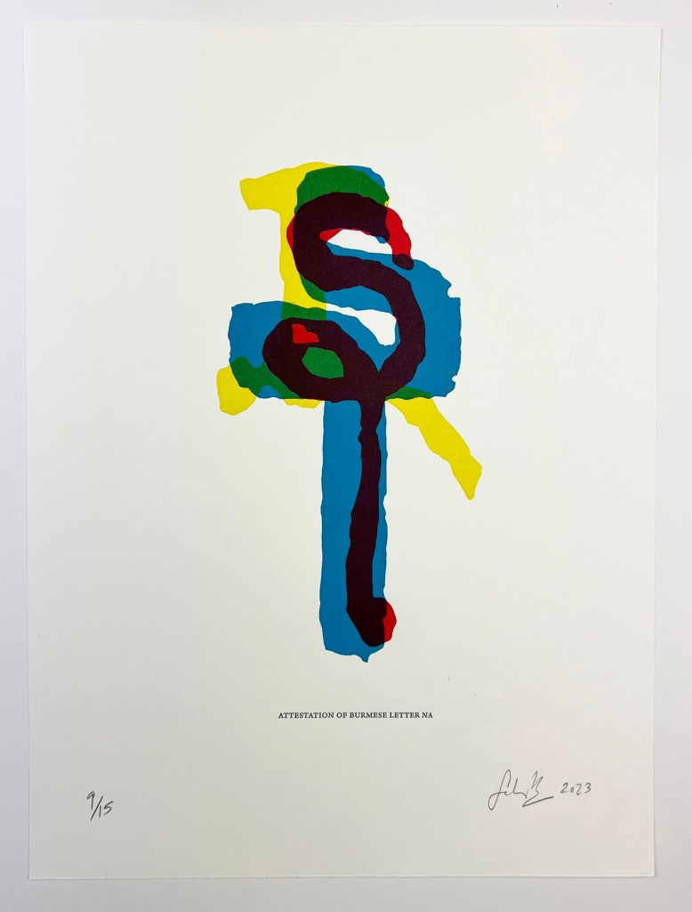 For this iteration of the Acts of Translation project, Ben and I spoke about his tactics for developing an understanding of the range of acceptable forms as he designs each character. Imagery for this book comes from Ben’s photographs of Burmese letterforms. He travels widely to find examples in manuscripts, temple inscriptions, impressions from lead type, and painted signs. I traced examples of the Burmese letter Na, carved them in linoleum, and printed them on translucent paper. Text for this project was gathered, edited, and recombined from a series of recorded interviews conducted in 2022.