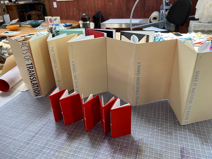 For the last two years I have been working on one project, a series of books titled Acts of Translation. I am working with each of five collaborators individually to design and produce an artist book about their experience through interviews, studio visits, and a collection of shared imagery. We are examining an act of translation, broadly defined for the purposes of this project as “the conversion and communication of information,” and interpreting that act through the combination of text, image, material choices, and book structure. I am issuing these books individually, but reserving part of the edition to release them as a bound set in a specially designed binding. Each of the books in this series effectively captures two acts of translation: first, the particular act of conversion and communication performed by individual at the heart of the book; second, my work as an artist to represent their act through the combination of text, image, material, and structure. This project seeks to highlight our shared experience, even when what we have in common is the difficulty inherent in communicating across divides.